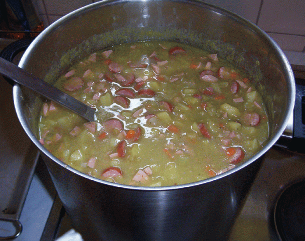 Wenn die Arbeit getan ist, wird im Pfarrheim gemeinsam zu Mittag gegessen. Abwechselnd kochen die Kolpingjugend oder Vorstandsmitglieder eine leckere Erbsensuppe mit Mettwurst und Brötchen.