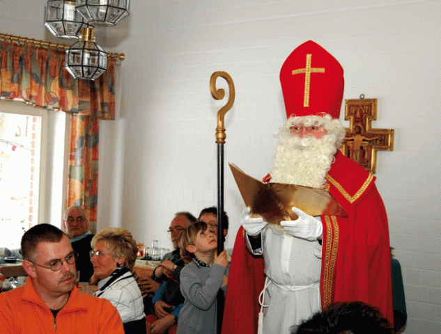 | Unsere Kolpingsfamilie bedient sich bei ihren Aktionen und Veranstaltungen immer wieder des christl. Brauchtums im Kirchenjahr. Dem Überdruss des weltlichen Weihnachtsmannes im roten Kapuzenmantel aus den Kaufhäusern und der Werbung zum Trotz, besucht uns in Halingen höchstpersönlich der Hl. Bischof Nikolaus. Im Bischofsgewand mit Mitra und Bischofsstab überrascht er nicht nur bei den Adventsnachmittagen im Pfarrheim unsere Kinder, Eltern und Großeltern. |  |